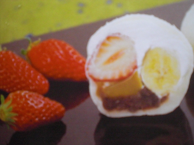 中にイチゴ・バナナ・栗・あんこ・ホイップクリームが入った「フルーツ大福」